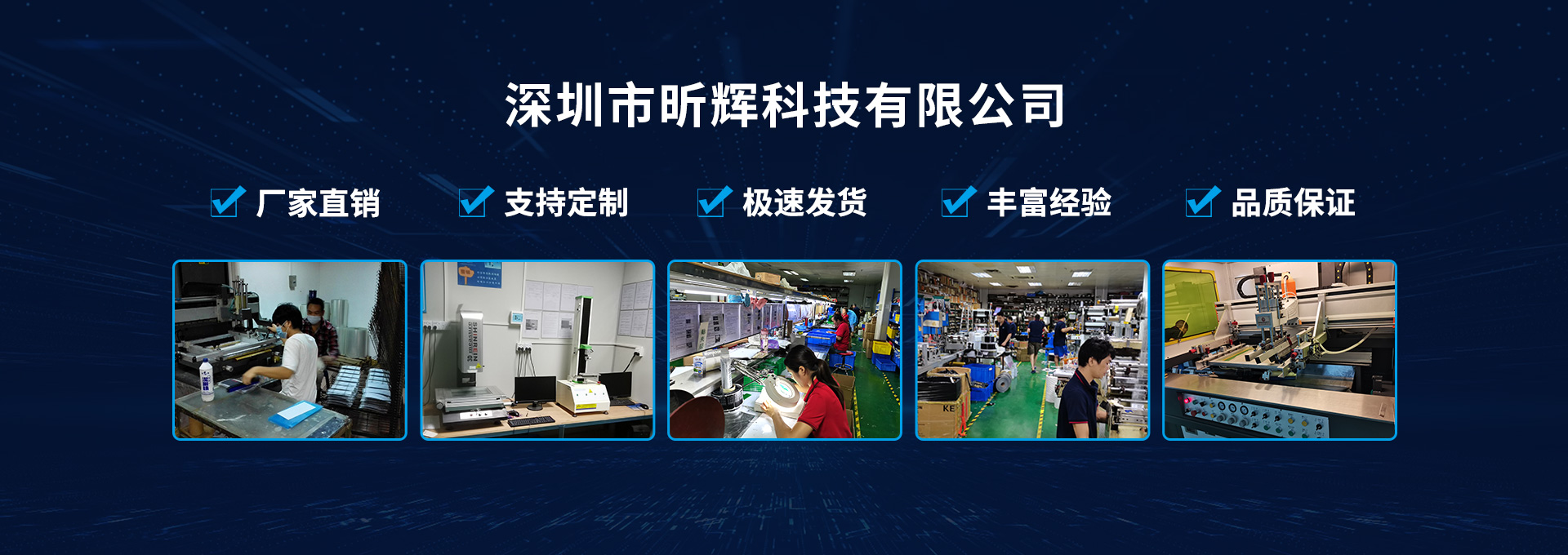 深圳市昕輝科技有限公司成立于2010年11 月,由廈門昕輝電子有限公司搬遷而來,位于中國深圳市坪山新區,地理位置優越。擁有16年的生產管理經驗,是一家集生產、銷售、設計于一體的生產型制造商。主要生產FPC/PCB/EL/LED薄膜開關、觸摸按鍵、薄膜按鍵、薄膜電路、觸摸電路、汽車重力傳感器、薄膜壓力傳感器、EMS腹部貼紙、EMS足部按摩器、EMS按摩器,EL發光酒標、EL發光標志、LED/EL背光、鍍金/鍍鎳、鍋仔片、金屬彈片、液晶顯示器、觸摸屏等產品。